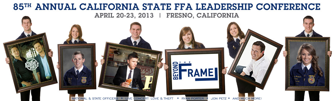 Created a 36" x11" poster to promote the 85th Annual California State FFA Leadership Conference, a state-wide event for FFA students to attend. This year's theme was "Beyond The Frame." The students shown on this poster are the 2012-2013 State Officers. The idea of the frames came from the officers, to tie into their theme. Photography by Bruce Robinson