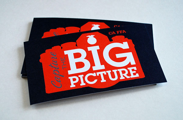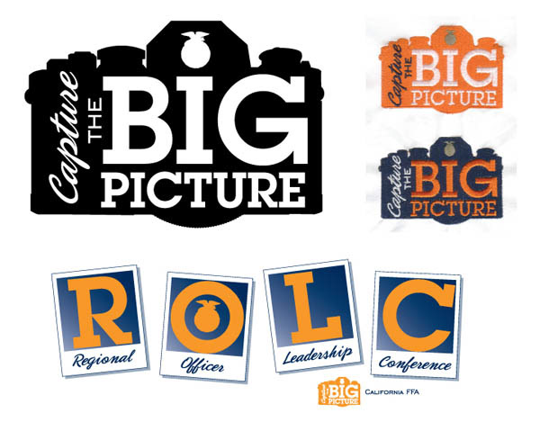 Logo design for California FFA theme "Capture The Big Picture." The client wanted a logo related to photography. The logo was digitized for embroidery and print. The logo, the colors of orange and navy, are a part of this year's theme. Printed on business cards, posters and apparel. In Spring 2013 it will become front & center on the Leadership Conference campaign materials (program, activity book, posters, etc).