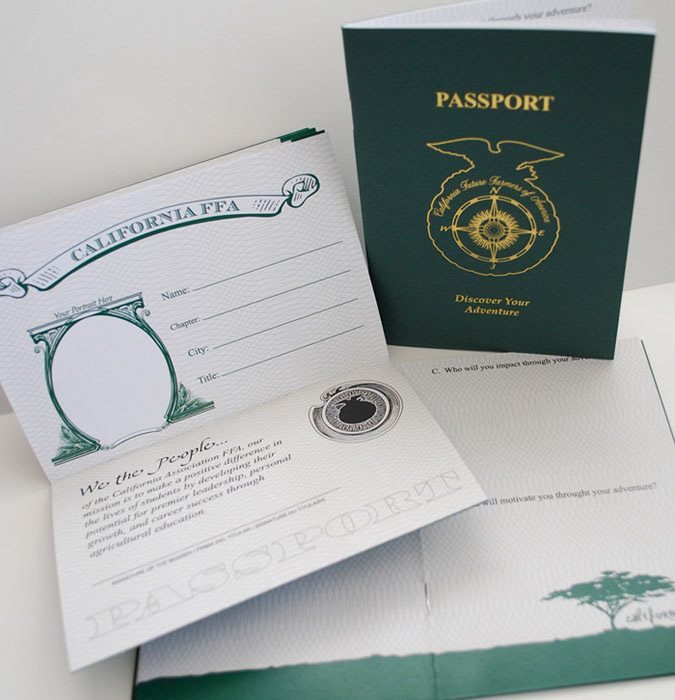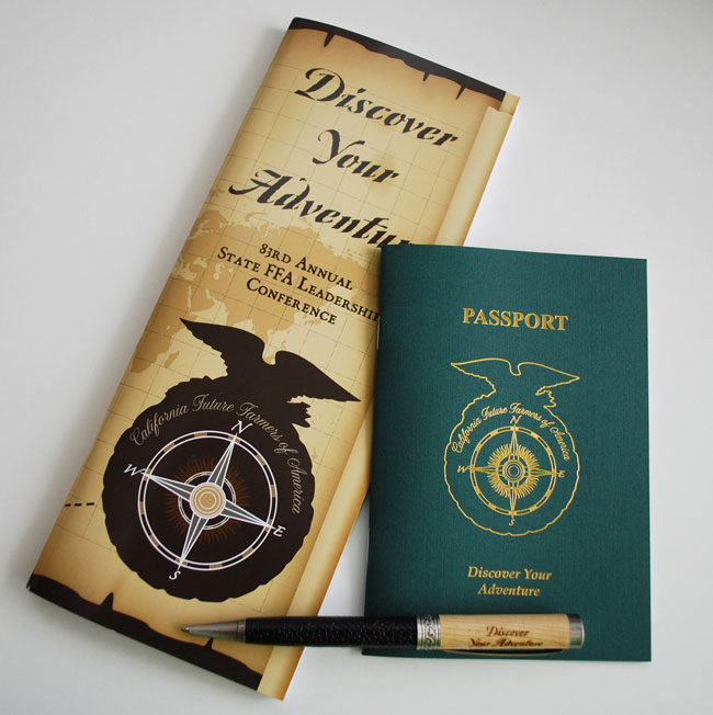 The theme for the 83rd Annual California State FFA Leadership Conference was "Discover Your Adventure." The client (state officers and staff) wanted to use travel and a map to go with their theme. The FFA logo, shown here as a silhouette, became the compass. An old map was used as the background on the programs. The activity book, which was designed, sized and made to look like a passport, had a gold foil embossed cover, pages with passport-like elements and room for students to document their activities. Laser engraved pens with the theme were given to officers and students.