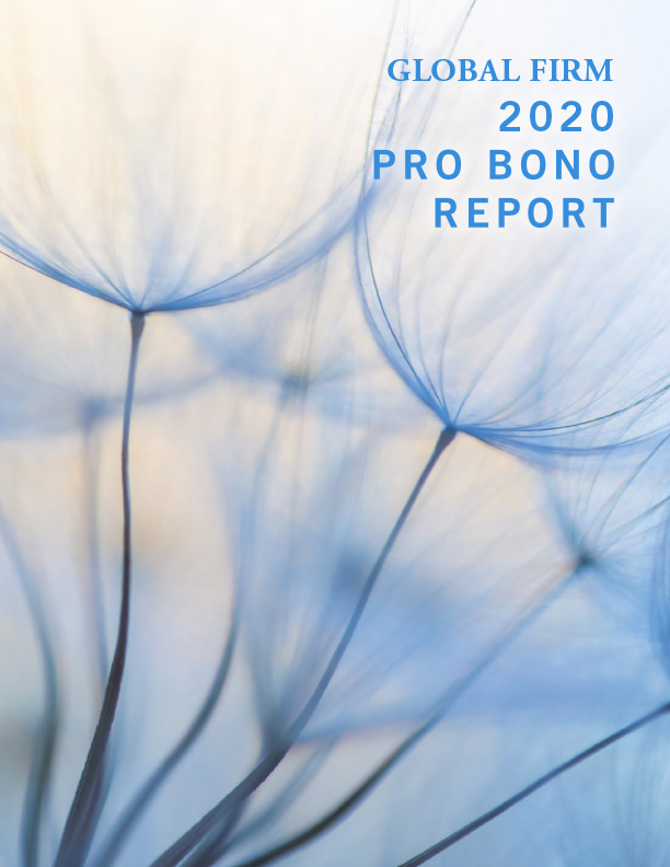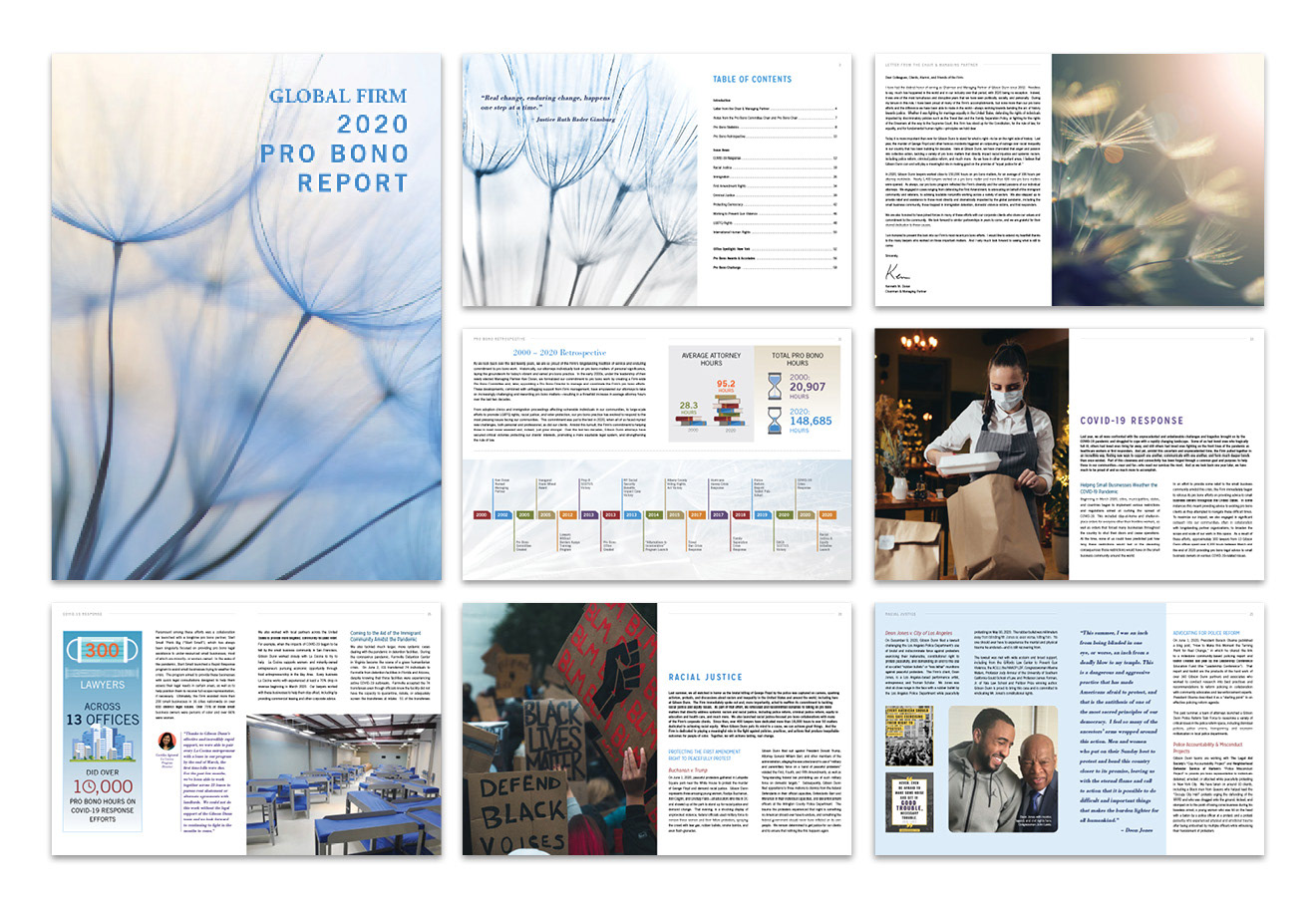 Annual report for global law firm's Pro Bono department. Created theme and laid out all pages, created infographics and use of client-provided and stock photography.