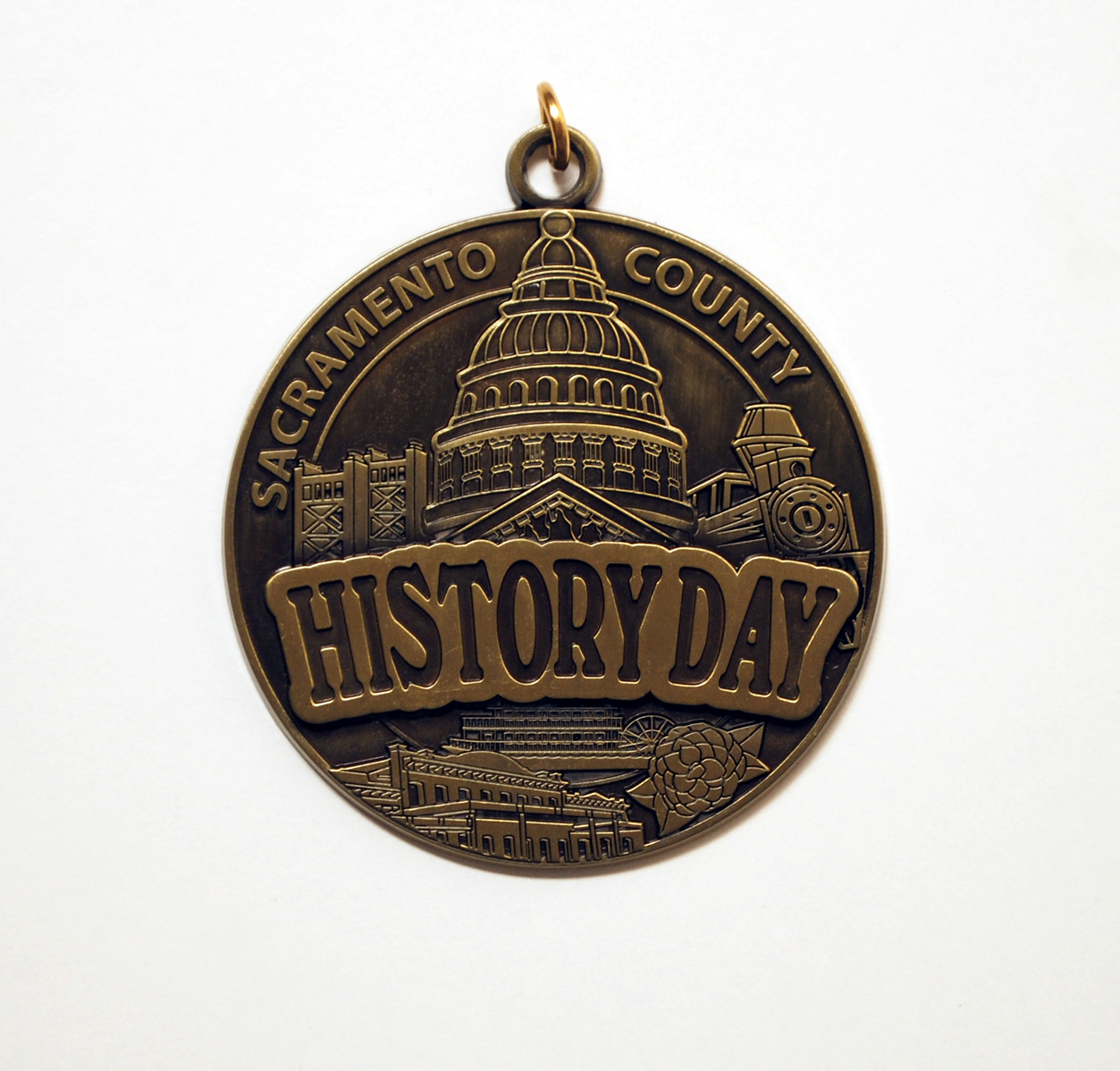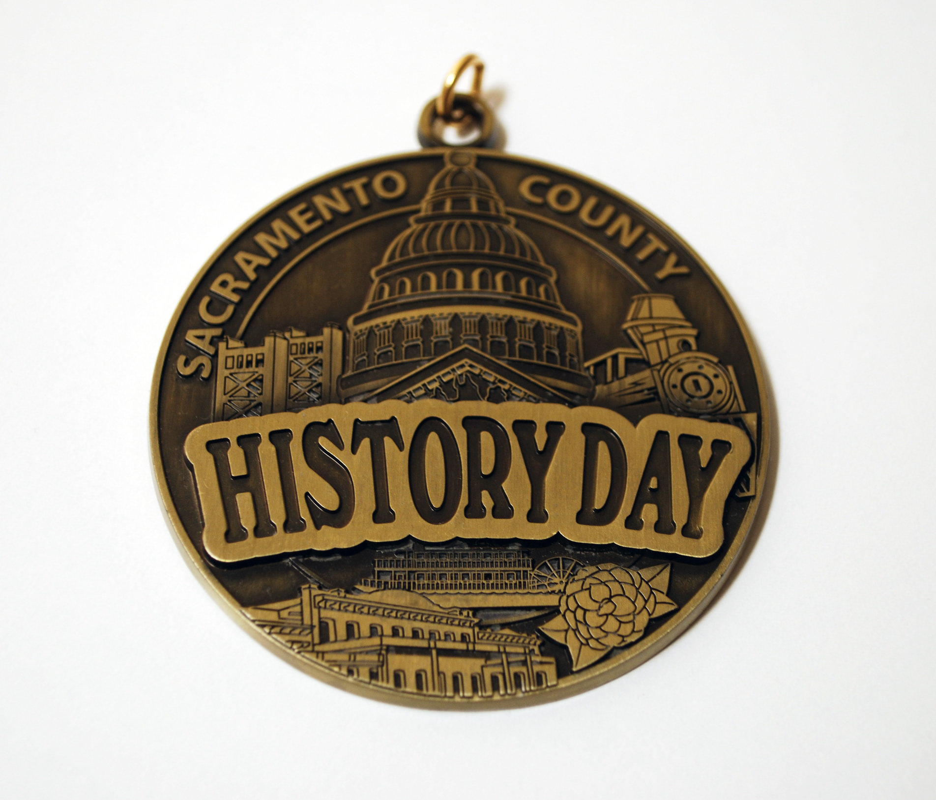 Sacramento County History Day bronze medallion with raised elements and an antique finish.